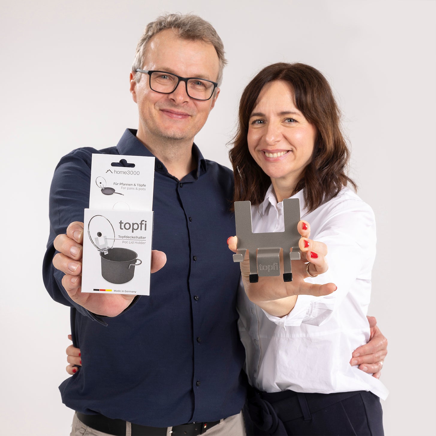 Hi, wir sind Annette & Tomasz. Zusammen suchen wir stets nach praktischen Lösungen für einen entspannten Alltag. Unsere Mottos,„Lebe Deinen Traum“ & „Weniger ist mehr“, haben wir dabei immer im Herzen. So auch, als uns die Idee zu topfi kam – dem Topfdeckelhalter, der den Kochalltag erleichtert.