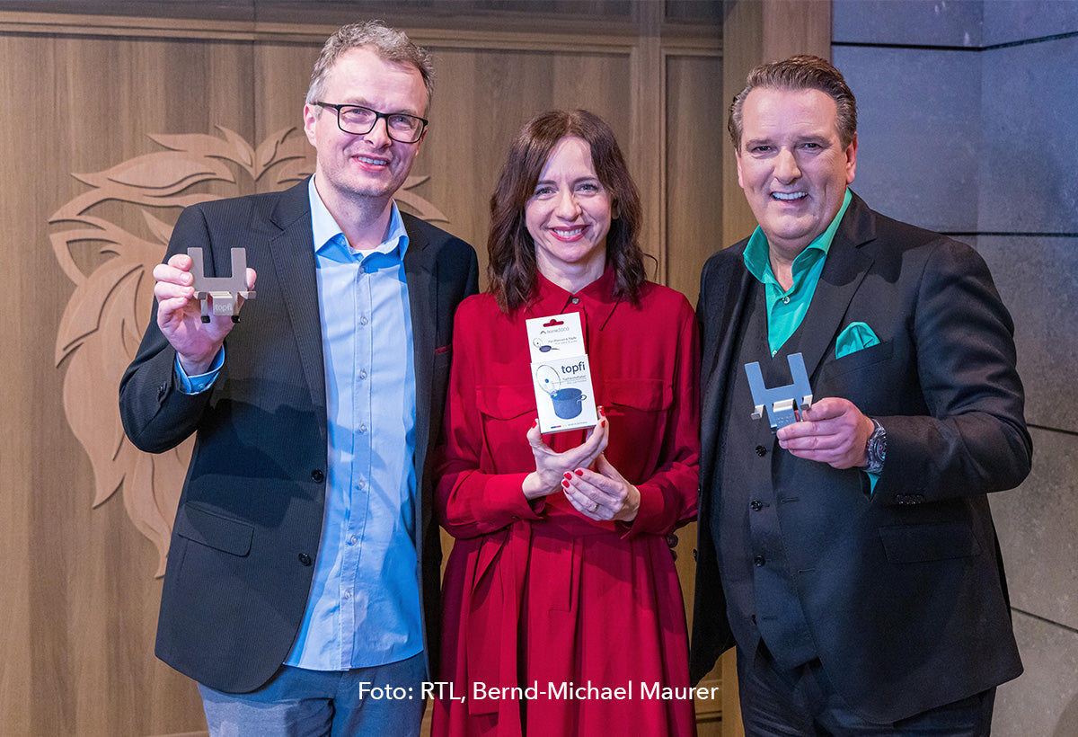 Wenn man bedenkt, dass topfi das Resultat einer recht simplen Alltagsfrage ist – nämlich 'Wohin mit dem Topfdeckel?“ –, dann ist es für uns persönlich umso beeindruckender, dass unser praktischer Topfdeckelhalter von Anfang an so beliebt und gefragt war. Was wir allerdings trotzdem nie zu träumen gewagt hätten, ist, dass wir den Alltagsküchenhelfer sogar mal in der Manege der Löwen präsentieren würden. Mit hauchdünnen Nerven warteten wir also auf das Feedback aus der Löwenrunde. Doch als Ralf Dümmel sein Go für den gemeinsamen Deal gab, war all die Anspannung plötzlich wie weggeblasen.